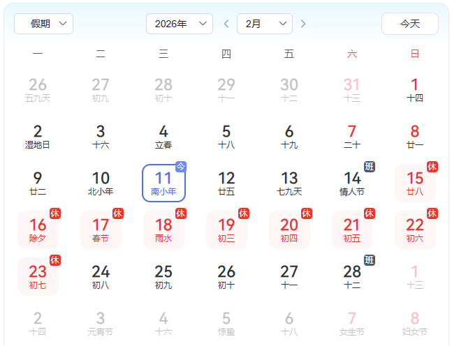 春节:2月11日(周三)至2月24日(周二)放假调休,共14天。2月25日(周三)上班
